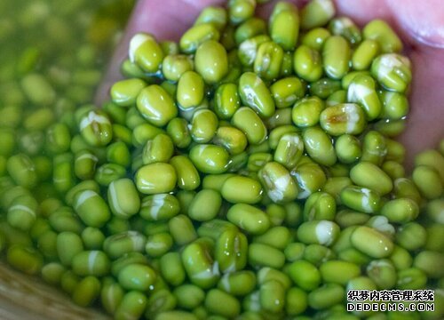 綠豆加水泡一夜,第二天綠豆就全部發(fā)芽了,只要胚芽頂開了綠豆的外皮就可以了。
